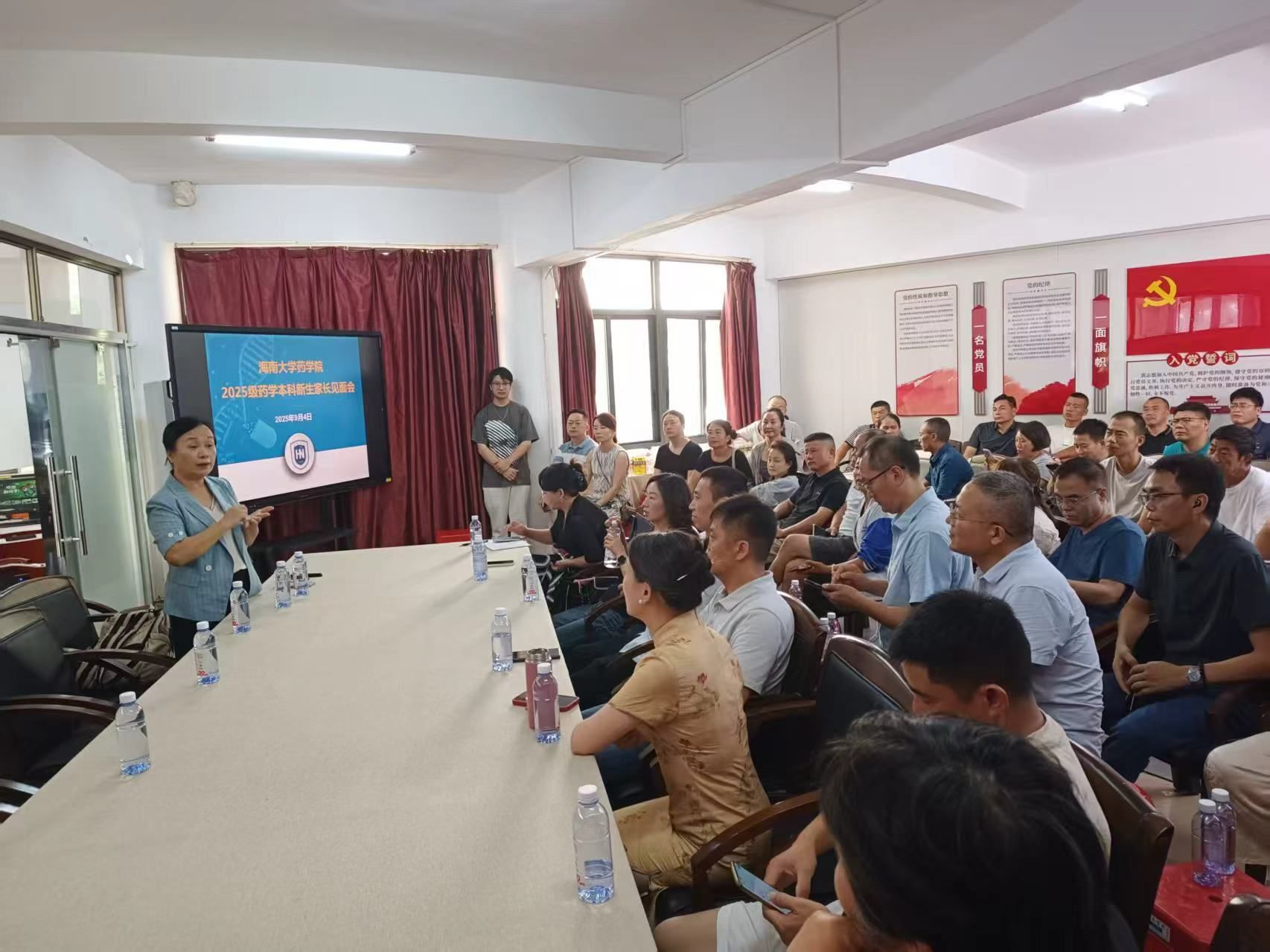 在子衿书院5号宿舍楼2楼会议室举办2025级药学专业新生家长见面会,近60名家长参加。会议由学院党总支书记胡静主持。
