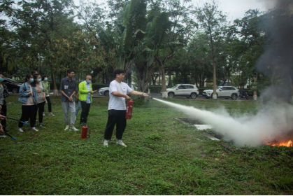 室内安全培训结束后,师生及消防科同志们来到生物楼西侧木球场草地上进行了实地灭火演练。所有师生实际操作了使用干粉灭火器灭火,并了解了灭火时的注意事项。