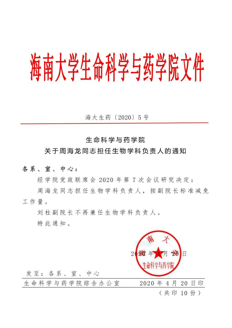 《生命科学与优德 关于周海龙同志担任生物学科负责人的通知》(海大生药[2020]5号))