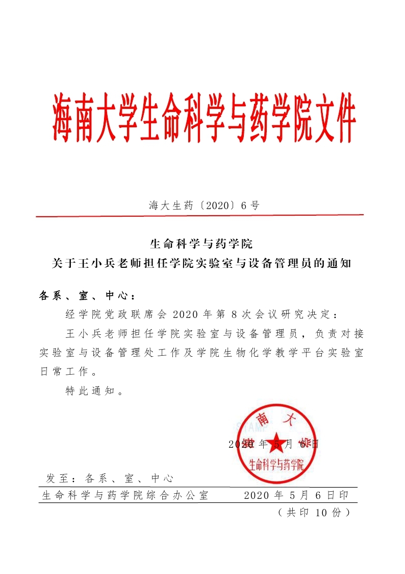 关于王小兵老师担任学院实验室与设备管理员的通知