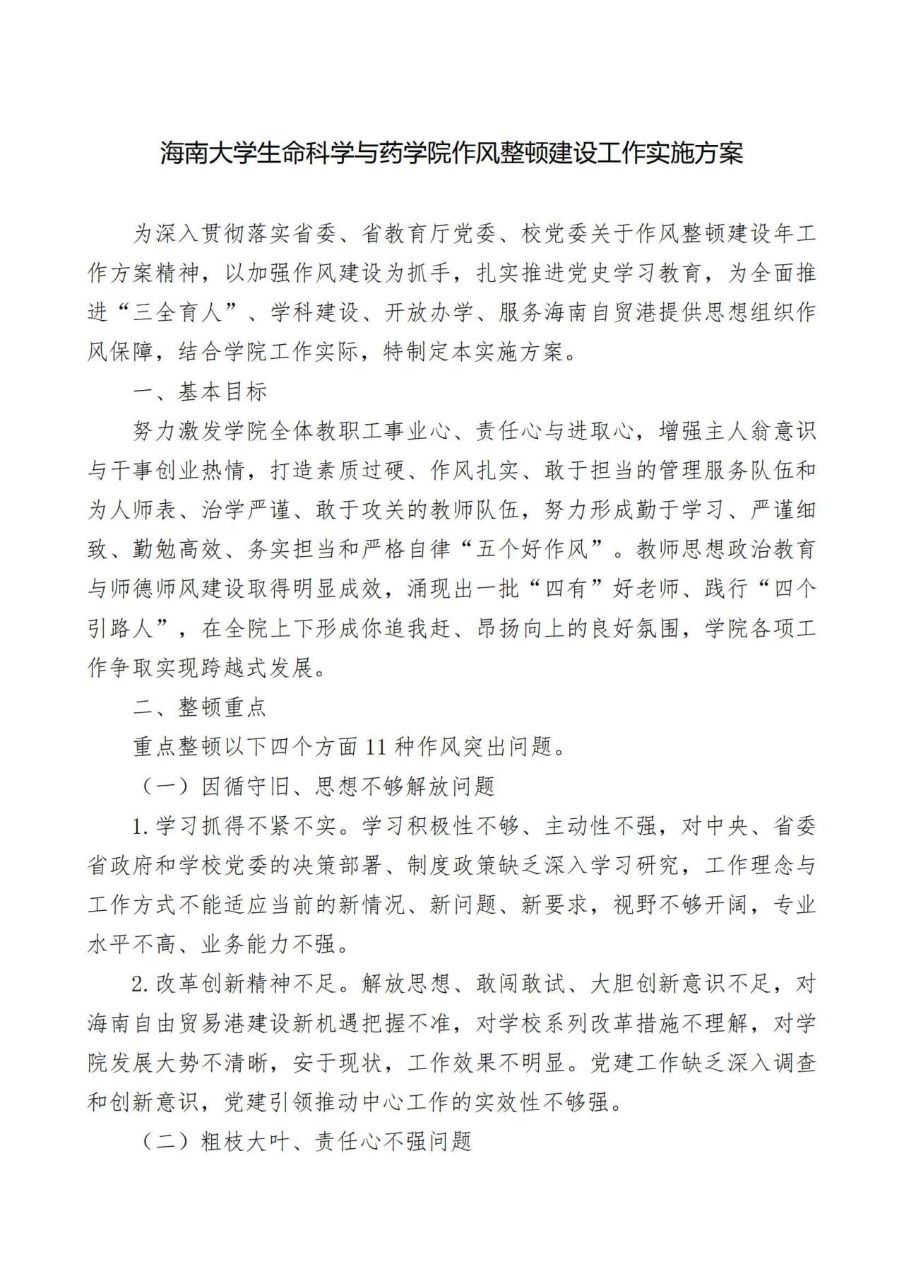 《海南大学生命科学与优德 作风整顿建设工作实施方案》(海大生药党〔2021〕14号)