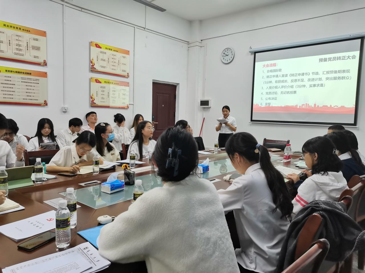 会上,骆蒙等6名中共预备党员依次上台宣读转正申请书并进行预备期个人总结汇报,经由入党介绍人对其预备期表现进行补充评议并发表是否同意按期转正,随后,党支部书记谢天宇老师代表支委会向大会汇报征集群众、党员、培养联系人意见情况,最后经过到场的具有投票权的8名正式党员讨论和无记名投票,一致同意6名中共预备党员按期转正并形成大会决议。