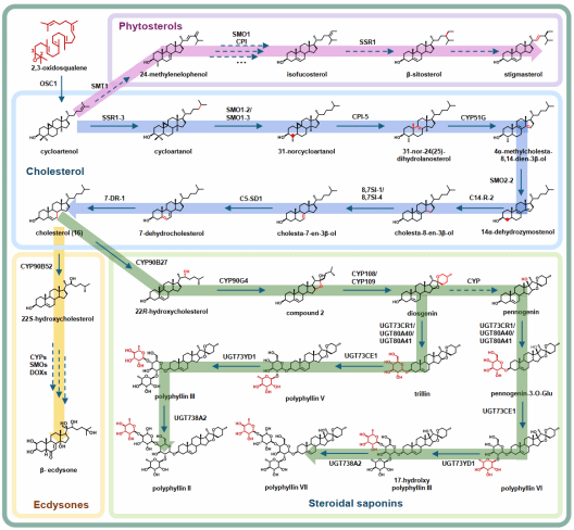 重楼(Paris polyphylla)是我国传统名贵中药材,具有清热解毒、消肿止痛、凉肝定惊等显著功效。重楼皂苷作为其核心药效物质基础,占植物总次生代谢产物的85%以上。然而,甾体皂苷复杂的生物合成途径及其异源生物合成中的关键技术瓶颈一直制约着该领域的发展。