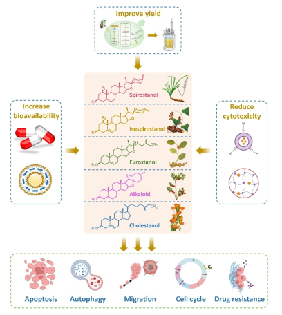 深入研究了甾体类天然产物的抗肿瘤活性机制,通过系统分析不同甾体化合物与肿瘤细胞分子靶点的相互作用,并基于分子靶点特异性提出了甾体类抗肿瘤药物的优化开发策略 (Phytomedicine 2024)(图3)。此外,基于仿生学原理,成功开发了复合微球新型骨修复材料,通过胶原蛋白的调节作用,显著改善了材料的生物相容性和骨传导性能,为骨损伤治疗提供了创新的技术方案 (International Journal of Biological Macromolecules 2023)。