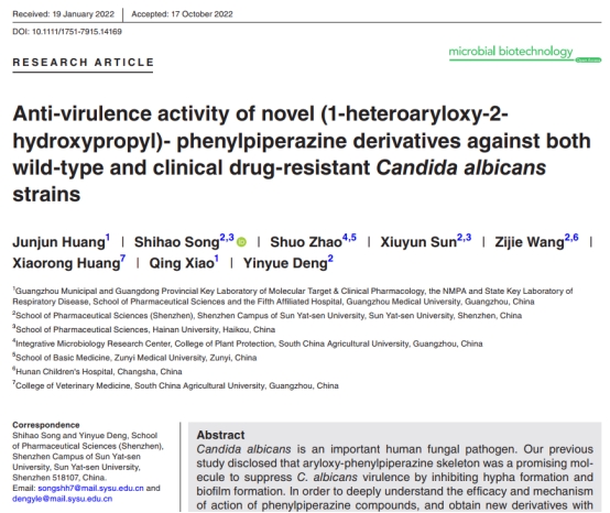 黄珺珺副教授在国际微生物学领域权威期刊Microbial Biotechnology(影响因子6.575)在线发表题为“Anti-virulence activity of novel (1-heteroaryloxy-2-hydroxypropyl)-phenylpiperazine derivatives against both wild-type and clinical drug-resistant Candida albicans strains”的研究论文。本研究合成了一系列新型苯基哌嗪类化合物,通过表型和毒力实验筛选获得了四个新的潜在药物分子,并通过三种小鼠模型验证了其治疗活性。同时,本研究还验证了该化合物对临床菌株的抗菌活性及其与抗生素的协同作用效果,尤其发现它们对临床耐药菌株具有良好的抗菌效果。本研究提供了一种新型的抗白色念珠菌抗菌策略,并获得了具有良好的抗白色念珠菌致病毒力活性化合物。这些化合物具有作为新型的抗真菌药物或佐剂的开发潜力,用于治疗由白色念珠菌,尤其是耐药白色念珠菌引起的感染。