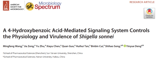 耐药病原菌信号通讯与药物研发团队在国际微生物学领域权威期刊Microbiology Spectrum(中科院1区,影响因子9.043)发表题为A 4-Hydroxybenzoic Acid-Mediated Signaling System Controls the Physiology and Virulence of Shigella sonnei的研究论文。本研究发现S. sonnei可以合成并感知小分子信号对羟基苯甲酸(4-hydroxybenzoic acid,4-HBA),该信号不仅在细菌-真菌跨界通讯交流中发挥重要作用,还可以调控S. sonnei的重要生理功能。