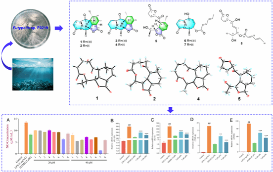 在这项工作中,团队从弯孢聚壳属真菌Eutypella sp. F0219中分离鉴定8个结构新颖聚酮类化合物,其中4个化合物具有10/6/5三环骨架,为自然界首次发现的一类多环稠和10元大环内酯类化合物。生物活性测试显示化合物7具有较强的抗炎活性,能降低LPS诱导的IL-1β, IL-6, TNF-α, 和iNOS等炎症因子表达;进一步研究发现化合物6−8为化合物1−5的生源合成前体,其可通过关键的分子内[4+2]环加成反应得到骨架新颖的多环大环内酯化合物1−5。上述研究成果以内封面论文发表在中科院一区期刊Chinese Journal of Chemistry。海南大学为第一单位,优德